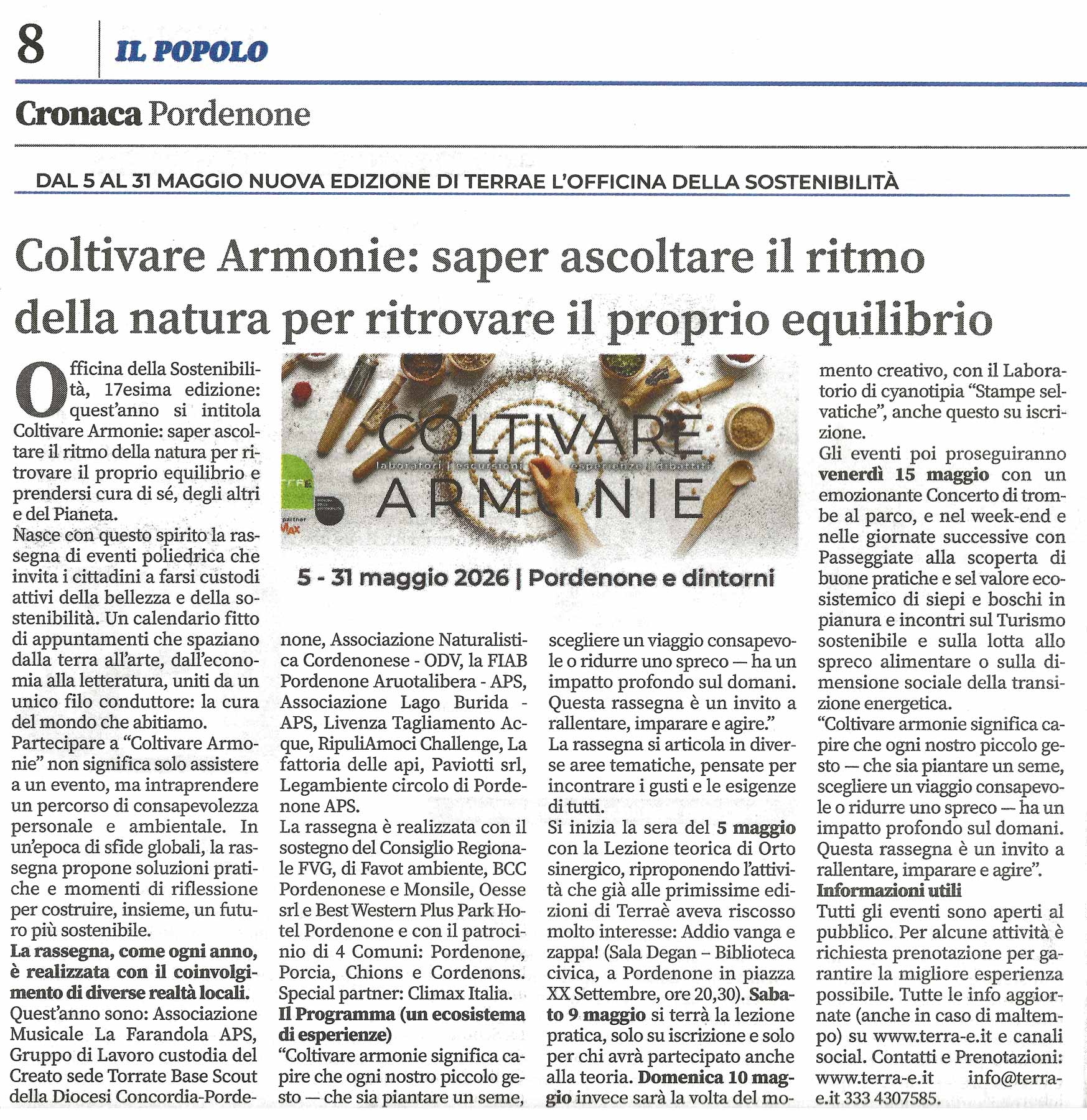 Nasce con questo spirito la rassegna di eventi poliedrica che invita i cittadini a farsi custodi attivi della bellezza e della sostenibilità. Un calendario fitto di appuntamenti che spaziano dalla terra all’arte, dall’economia alla letteratura, uniti da un unico filo conduttore: la cura del mondo che abitiamo. […]