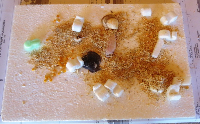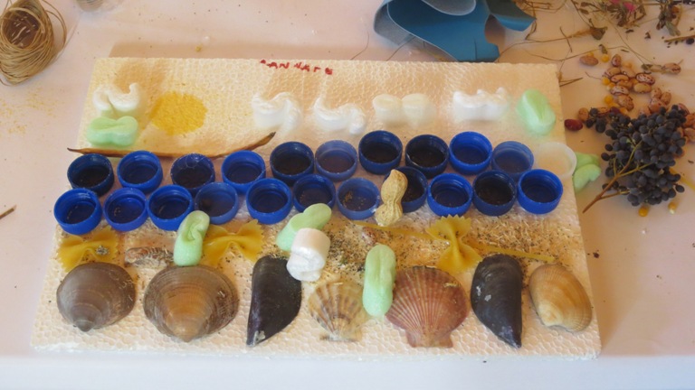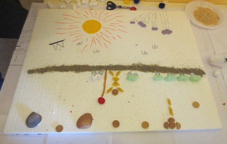 Helen&Alessia (13 e 10 anni) Paesaggio naturale La spiaggia (realizzata con la farina di mais) con le sue conchiglie e sassolini (viti …