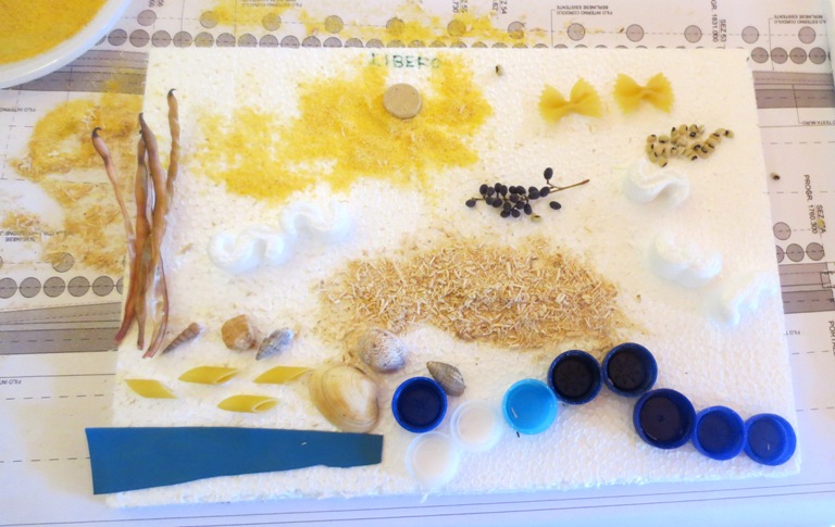 Autore: Libero Luigi (3 anni) Paesaggio naturale Il mare (realizzato con scampoli di tessuto colorato da tappezziere e tappi di plastica blu) …