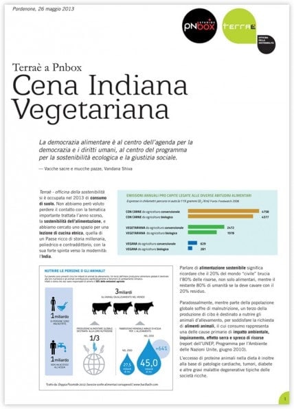 L’edizione 2013 di Terraè si è concentrata sul consumo di suolo. Non abbiamo però voluto perdere il contatto con la tematica trattata l’anno scorso, la sostenibilità dell’alimentazione, e abbiamo cercato uno spazio per una lezione (e cena) di cucina etnica, avvicinandoci alla cultura di un Paese ricco di storia millenaria, poliedrico e contraddittorio, con la sua forte spinta verso la modernità: l’India.