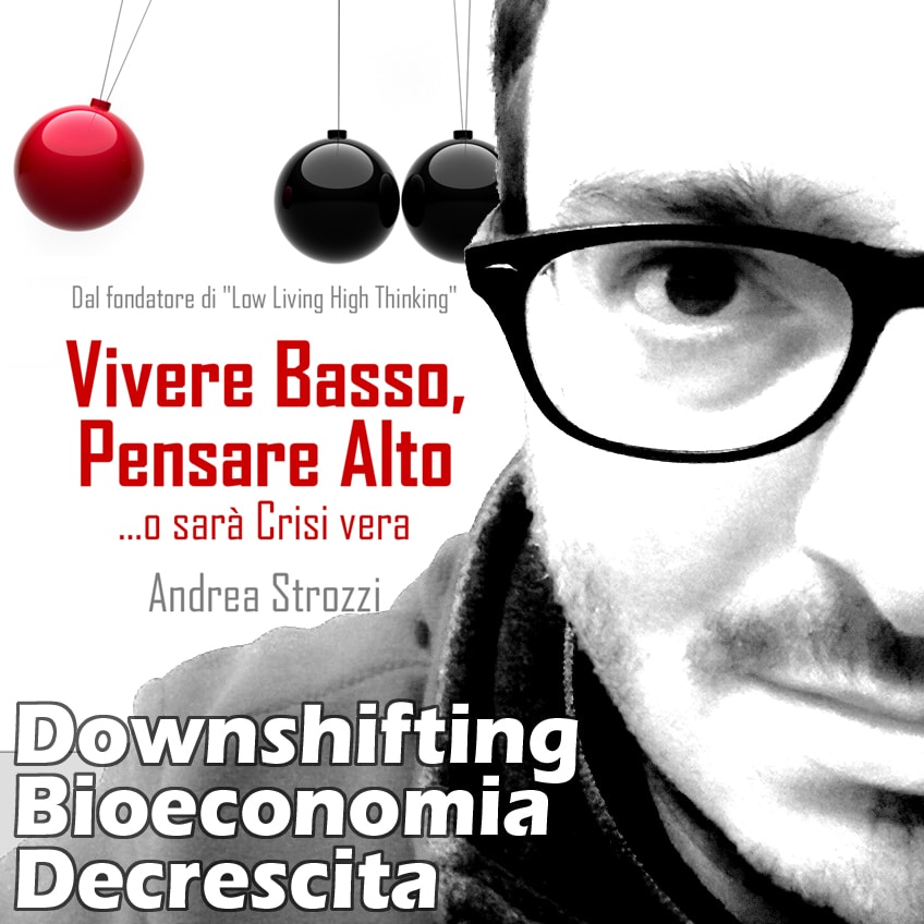 Andrea Strozzi, Fondatore di LLHT.org (Low Living High Thinking), bioeconomista e scrittore, si laurea in Statistica Economica a Bologna nel 1998, lavora per quindici anni nella governance di grandi Gruppi Bancari. Nel frattempo si sposa e ristruttura una vecchia stalla, tra campi e boschi. È l’anno II a.LB. (avanti Lehman-Brothers) e i suoi pensieri-guida sono già sostenibilità e resilienza. Nel 2012 avvia LLHT, per uno stile di vita metaconsumistico, discute e provoca su Bioeconomia e Decrescita. Poiché ogni vero cambiamento ha sempre tre ingredienti: sogno, consapevolezza e linguaggio, nel 2014 smette di essere quello che fa e comincia a fare quello che è: riparte da zero e lascia il suo posto fisso.