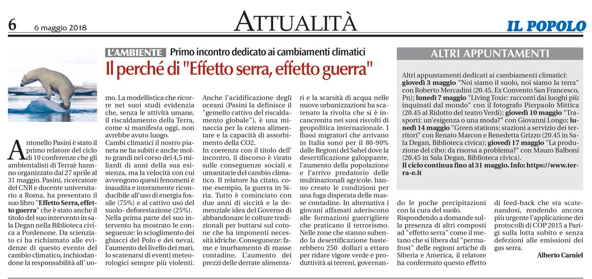Antonello Pasini è stato il primo relatore del ciclo di 10 conferenze che gli ambientalisti di Terraè hanno organizzato dal 27 aprile al 31 maggio. Pasini, ricercatore del CNR e docente universitario a Roma, ha presentato il suo libro “Effetto Serra, effetto guerra” che è stato anche il titolo del suo intervento in sala Degan nella Biblioteca civica a Pordenone. Da scienziato ci ha richiamato alle evidenze di questo evento del cambio climatico, inchiodandone la responsabilità all’uomo. […]